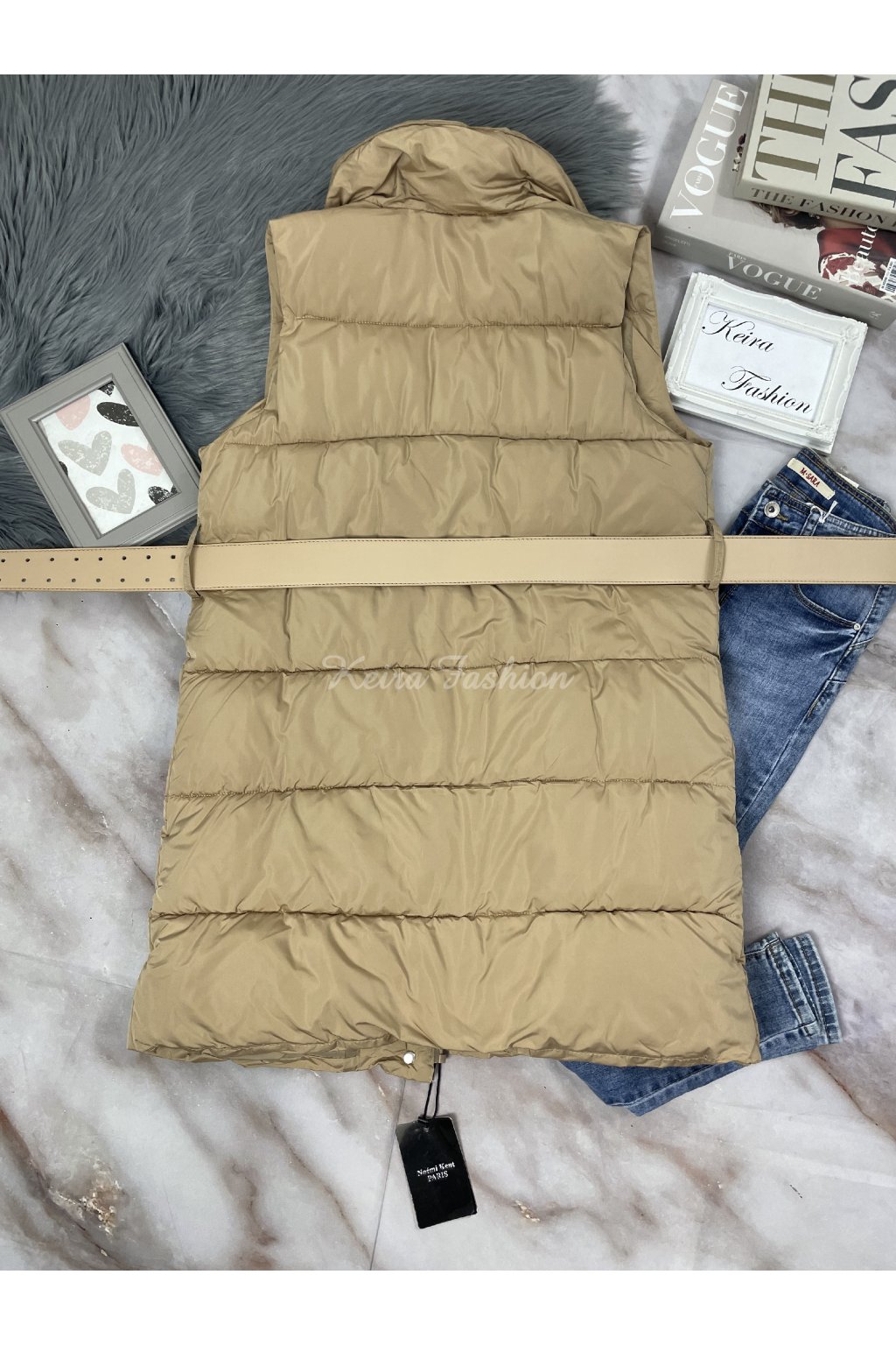 Štýlová a praktická dámska hrubá prešívaná vesta v béžovej farbe, ideálna na chladnejšie dni. Vesta má moderný predĺžený strih, výrazný golier a zapínanie na cvoky. Súčasťou je široký opasok v rovnakej farbe, ktorý zvýrazní pás a dodá outfitu ženský tvar. Vesta je vhodná na vrstvenie – perfektne sa hodí k roláku, svetru alebo mikine.